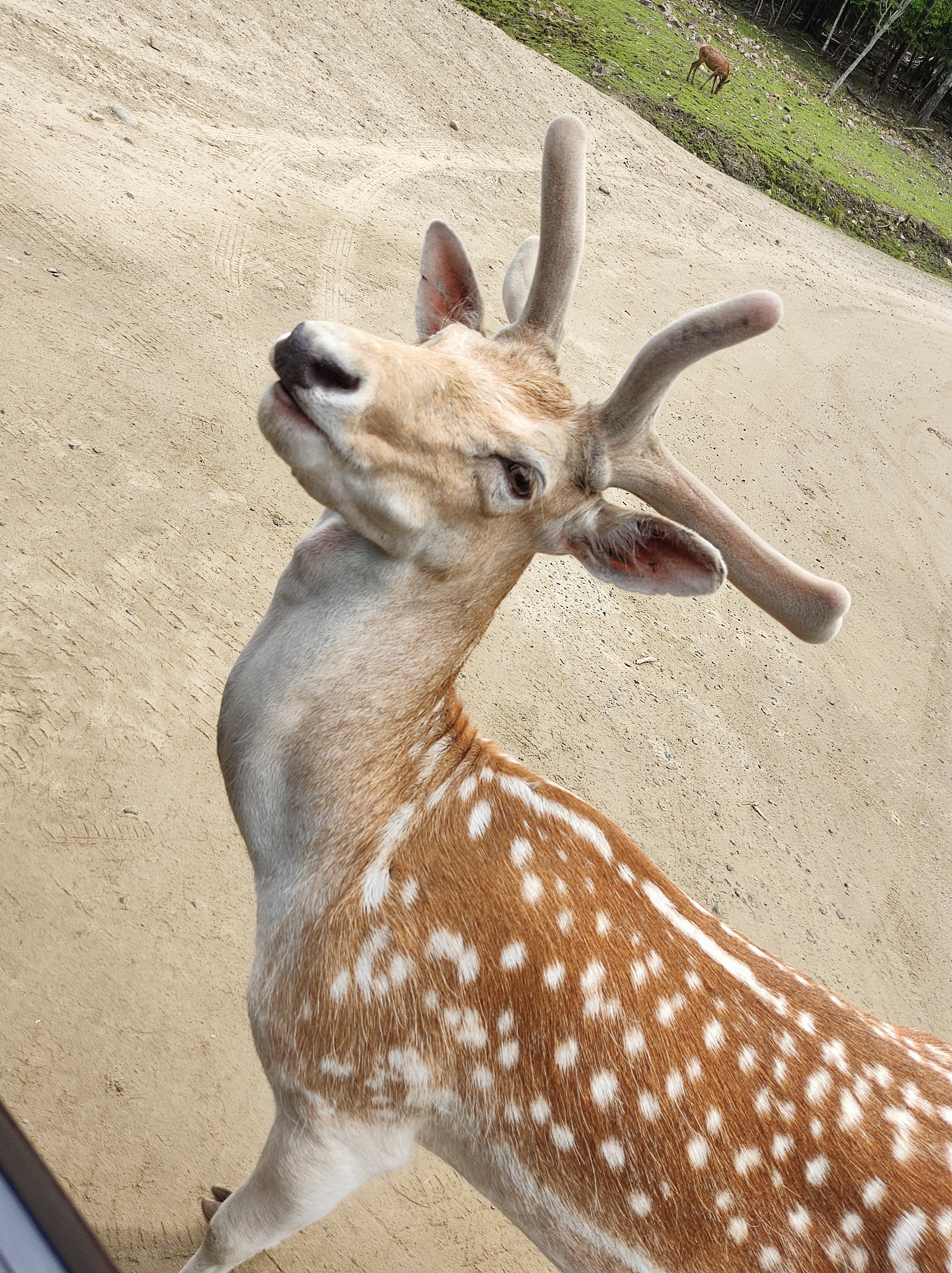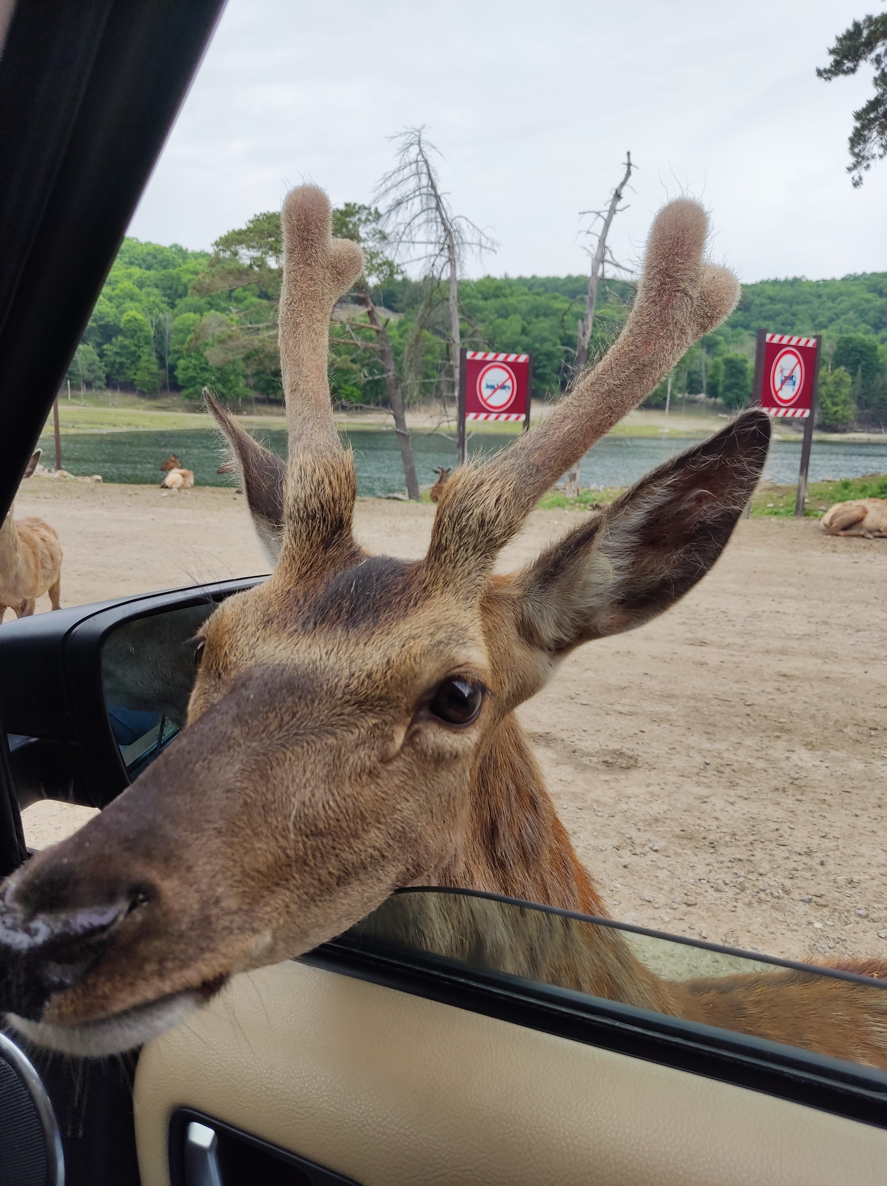 A bord de notre 4×4, nous sommes partis pour un parcours safari de 12km ! Et on débute par la section des herbivores, qui est la plus populaire, car nous pouvons nourrir des cerfs, élans, wapitis, daims, caribous… Ils ne sont pas farouches et s’approchent des véhicules, voir certains voudraient y entrer, attirés par l’odeur des carottes! Il y a aussi une section pour les carnivores, où nous avons pu observer des loups, coyotes, ours noirs, ours bruns. Nous sommes aussi passés à côté d’un troupeau de bisons, là il faut garder les fenêtres fermées et pas question de leur donner des carottes!!