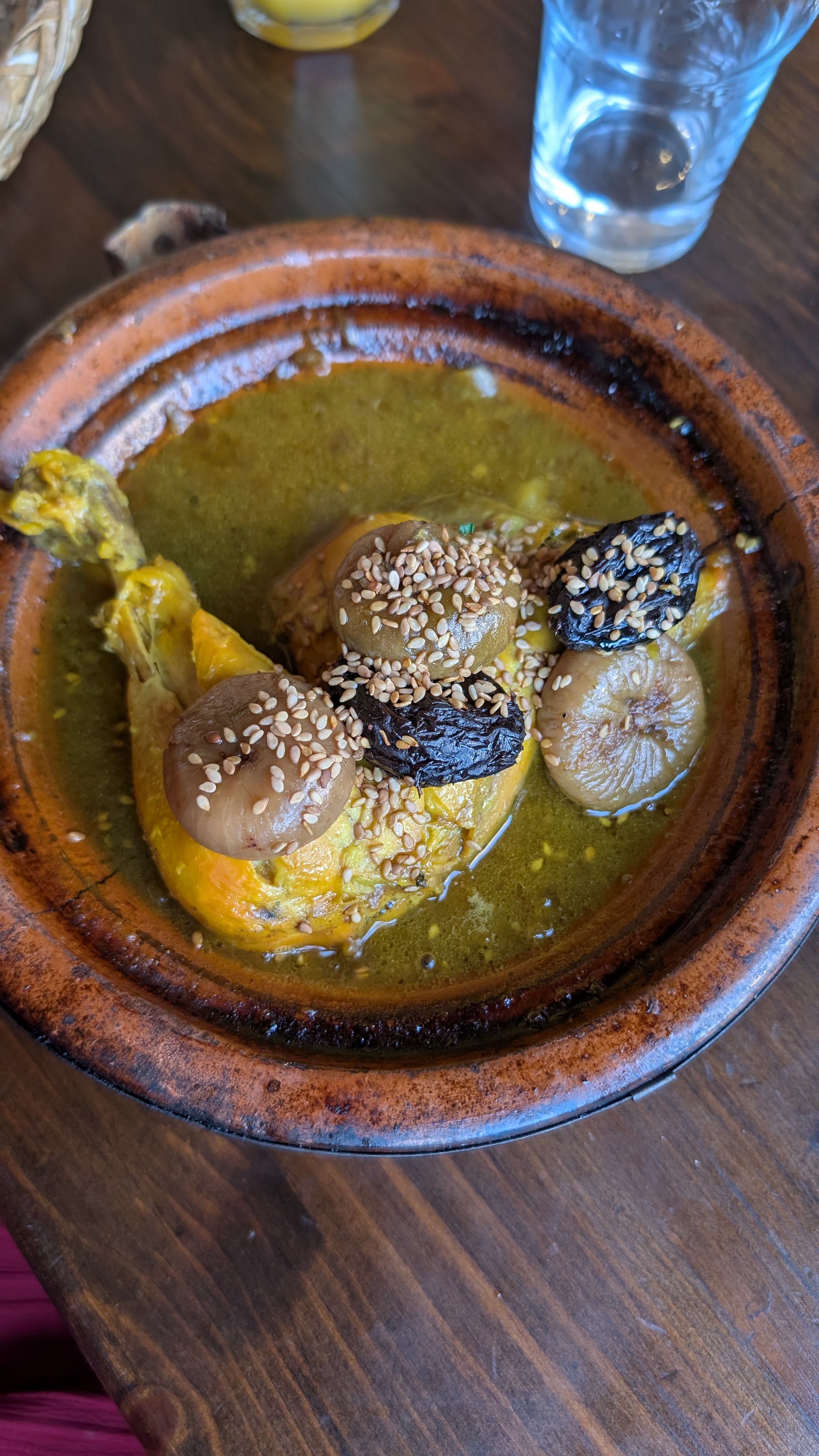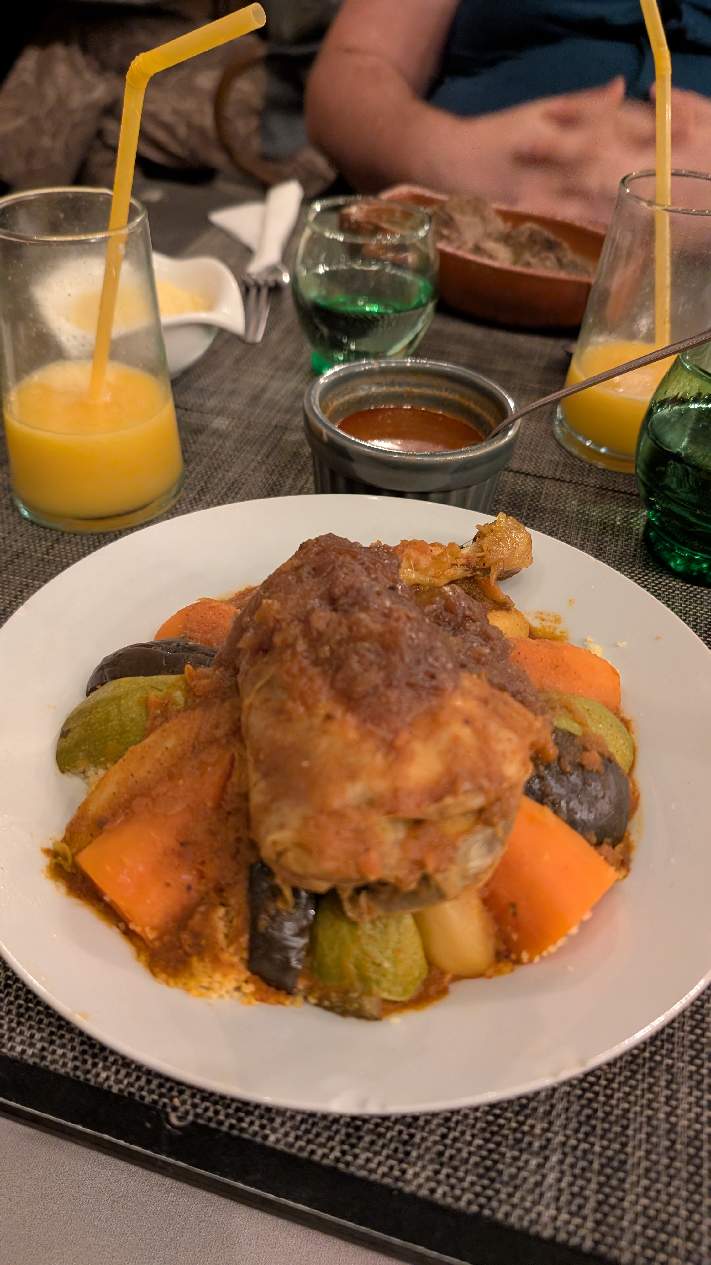 J’ai dîné au restaurant « la terrasse panoramique de la place », à côté du café de France. La terrasse offre une belle vue sur la place et le coucher de soleil, et permet de profiter de l’animation, un peu plus au calme que directement sur la place. Le menu tagine, dessert et thé à la menthe 104DH.