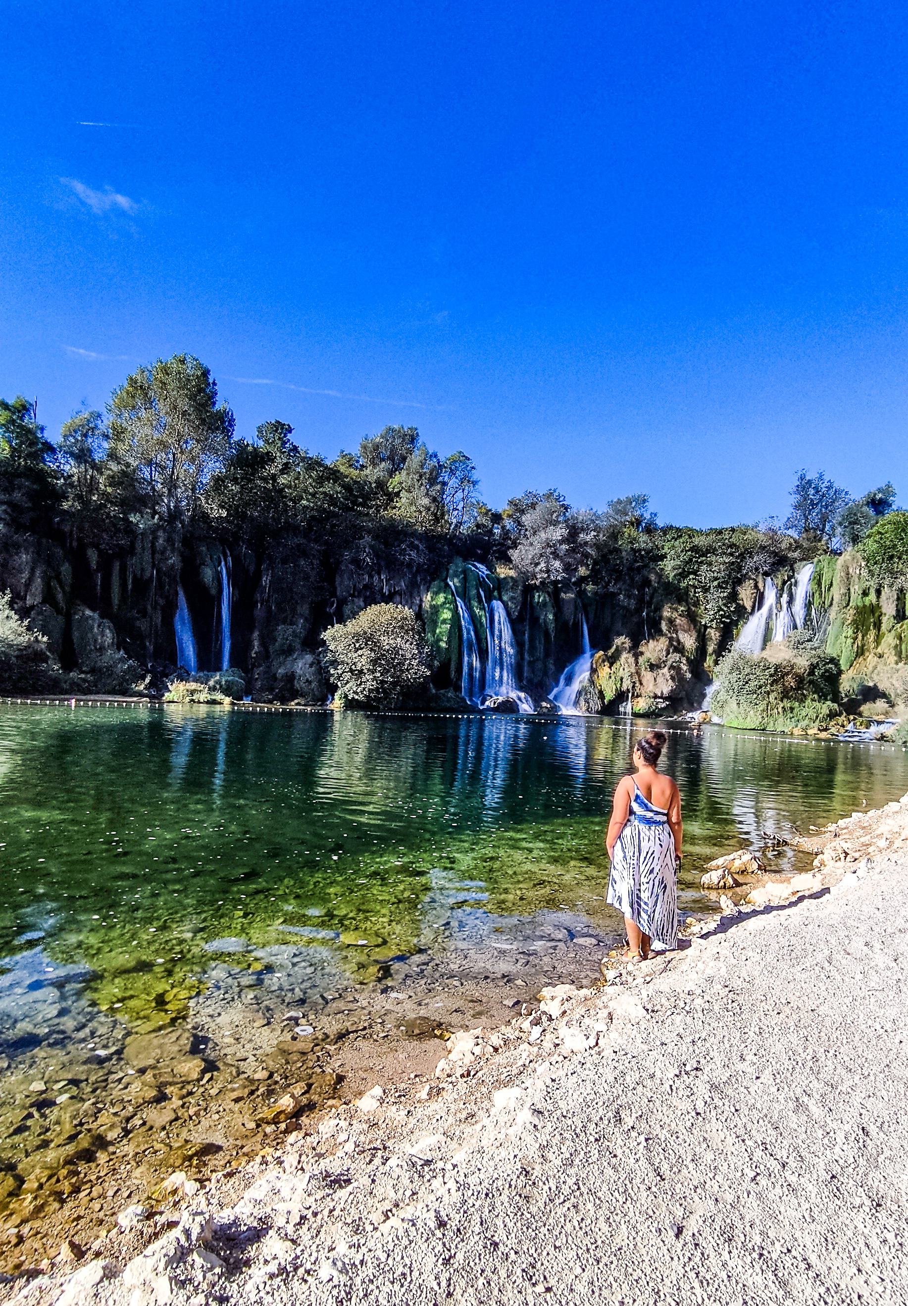 Réveil matinal pour me rendre aux cascades de Kravica. J’ai 25min de route pour m’y rendre. Je souhaite arriver tôt pour éviter le monde et être tranquille sur les lieux. Il est tout juste 8h et je me gare sur le parking, je vais pour payer mon entrée et le parking, mais le gardien me laisse entrer gratuitement! Ravie, j’entame la petite marche (400m) pour aller au plus près de la cascade, je suis bien la première et je serai seule pendant une trentaine de minutes! Je reste environ 1h sur les lieux, c’est calme et apaisant à cette heure ci. Seul bémol, les cascades ne sont pas entièrement au soleil, à cette heure ci.