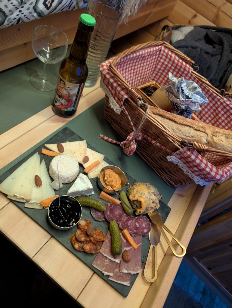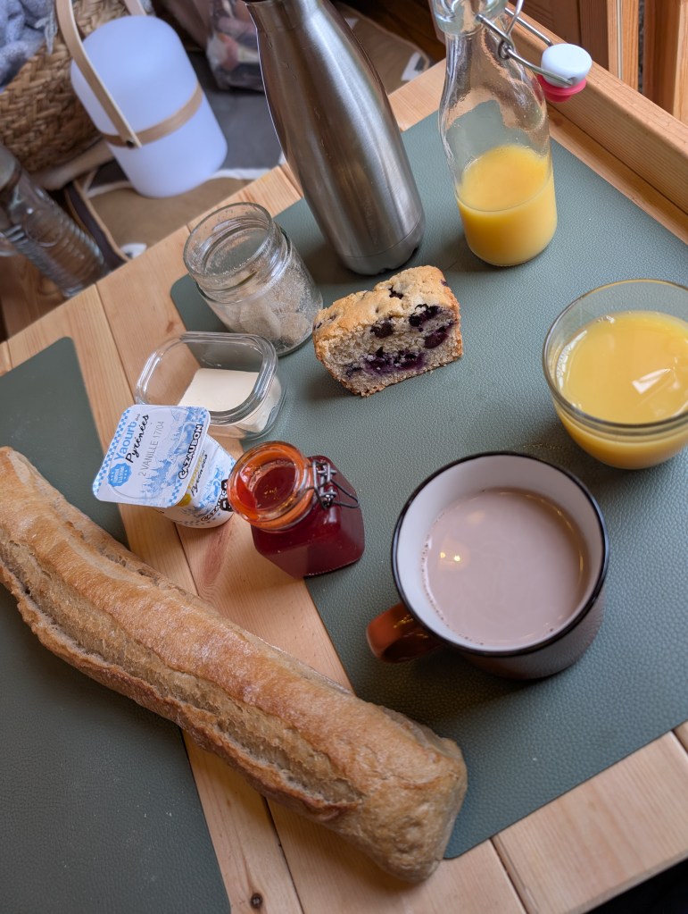 A l’heure du dîner, Anne-Laure m’a amené une planche apéritive avec fromages et charcuteries, ce ne sont que des produits locaux venants des fermes aux alentours. Et le matin, le panier petit déjeuner est servit à l’heure de votre choix, composé d’une boisson chaude, jus bio, pâtisserie et du pain frais.